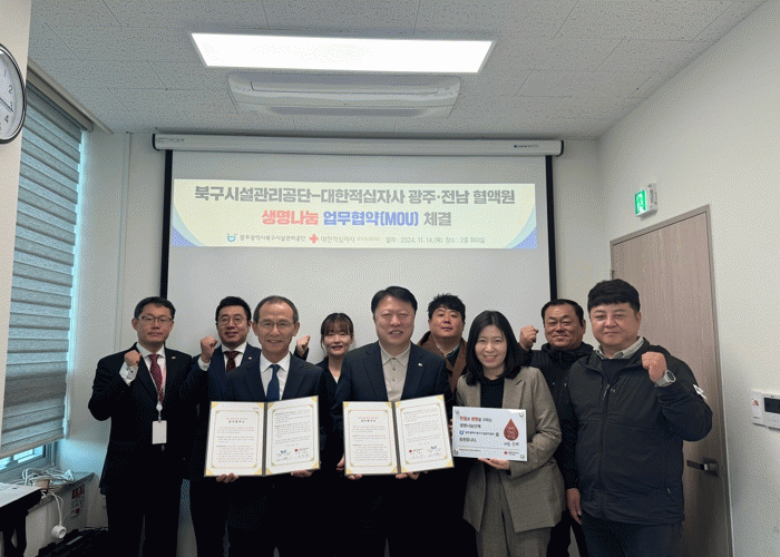 광주북구시설관리공단 나기백 이사장은 “이번 협약을 통해 소중한 생명을 살릴 수 있는 헌혈에 동참하는 계기가 되기를 바란다”며, “공단 직원들의 정기적인 헌혈 참여를 통하여 건강한 지역사회 구현에 앞장서겠다”고 밝혔으며,