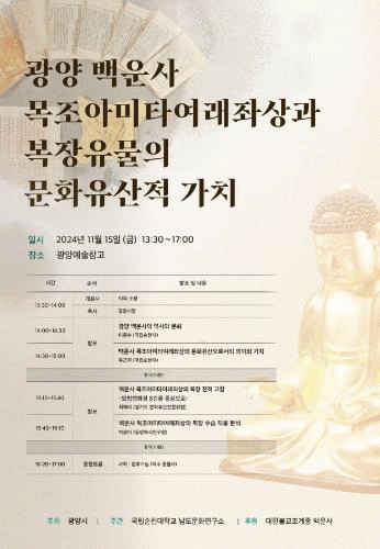 김명덕 문화예술과장은 “이번 학술대회를 계기로 백운사 목조아미타여래좌상 및 복장유물의 문화유산적 가치와 광양 불교의 역사적 위상이 재조명되길 바란다”라며 “현재 우리 광양에는 중흥산성 삼층석탑이 유일한 보물로 지정되어 있으나, 또 하나의 보물이 지정될 수 있도록 힘쓰겠다”라고 말했다.