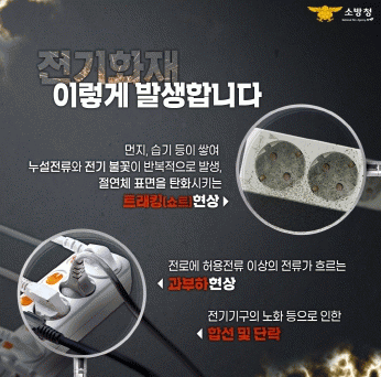 전기화재 예방 안전수칙으로는 ▲문어발식 전기 콘센트 사용 금지 ▲합선 예방을 위한 전선 피복 손상 여부 확인 ▲사용하지 않는 전기제품의 전원을 끄고 플러그 제거 ▲플러그 머리 부분 잡고 뽑기 ▲젖은 손으로 콘센트 만지지 않기 등이다.