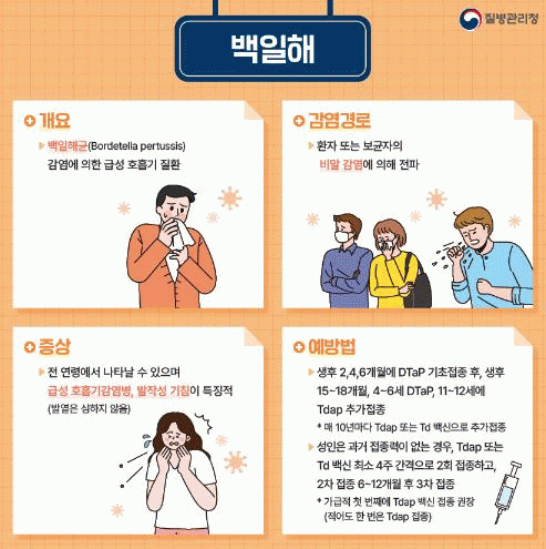 백일해는 발작성 기침을 특징으로 하는 급성 호흡기 감염병으로, 국내를 포함한 전 세계적으로 유행하고 있으며, 백일해 감염 시 중증 합병증을 초래할 수 있어 고위험군에 대한 보호가 필요하다.