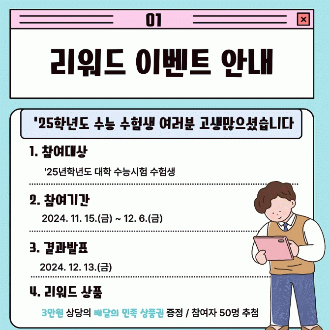15일부터 12월 6일까지 진행되는 ‘수능 힐링 리워드 이벤트’는 무료로 개방되는 관광지를 방문하여 본인 sns 계정에 방문사진 및 후기를 게시하면 추첨을 통해 3만원 상당의 기프티콘을 지급할 예정이다.