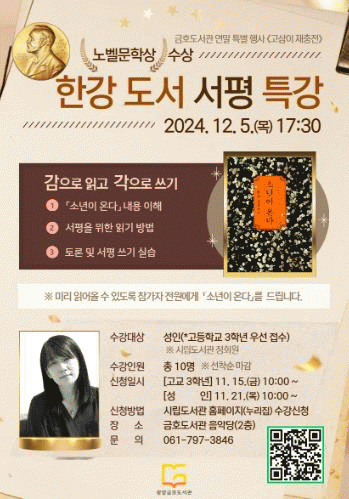 12월 5일 오후 5시 30분에는 올해 노벨문학상 수상자인 한강 작가의 도서 〈소년이 온다〉를 소재로 ‘한강 도서 서평 특강’을 진행한다.