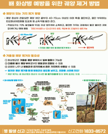 강인근 미래농업팀장은 “화상병은 가지마름증상과 유사하여 구분하기가 쉽지는 않다. 그러나 마른 가지가 지팡이처럼 구부러지고 잎이 떨어지지 않은 채 말라 있으며 줄기에는 눈에 띄는 암갈색 궤양병반이 생기는 특징을 보인다”며 “작업자와 농기계, 작업도구 소독은 반드시 실천하고 의심 증상이 관찰됐을 때 가까운 농업인상담소나 기술보급과로 연락 신고해주길 바란다”고 강조했다.