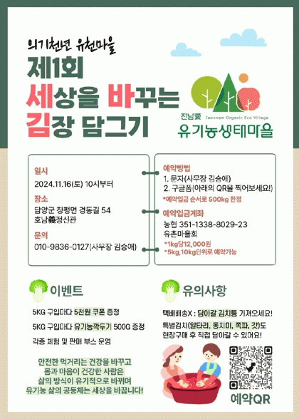 행사는 배추, 알타리, 쪽파, 갓 등을 현장에서 구매해 진행하는 김치만들기 체험부터 생태마을 친환경 농산물 판매 부스 운영, 유천 유기농생태마을 및 유천리 내 호남 의(義)정신관 탐방 등으로 구성해 참여자가 자유롭게 즐길 수 있도록 했다.
