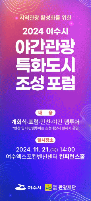 시 관계자는 “여수시는 오래전부터 야간관광을 미래 관광산업의 신성장 동력으로 인식하고 준비해 왔다”며 “이번 포럼에서 심도 있는 토론, 우수 지자체 사례발표 등을 통해 야간관광산업을 더욱 발전시켜 나가겠다”고 말했다.