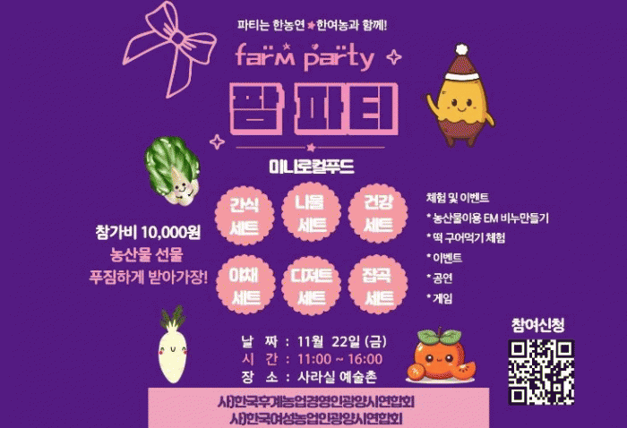 이번 팜파티는 (사)한국후계농업경영인광양시연합회와 (사)한국여성농업인광양시연합회가 주관하는 행사로, 우리 지역농산물을 주제로 먹거리, 볼거리, 즐길거리 등 다양한 콘텐츠가 마련돼 있다.