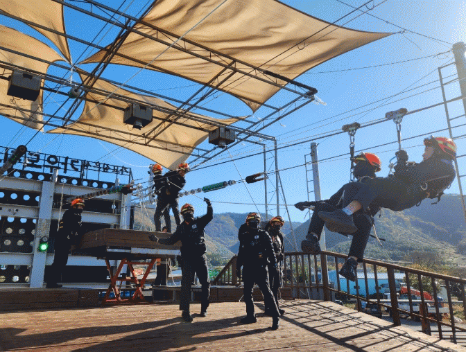 주요 훈련 내용으로는 ▶짚라인 업체의 마중이를 이용한 기계식 구조, ▶구조대원이 주레일을 이용하여 구조대상자에게 접근하는 접근식 구조 방법 등이었다.