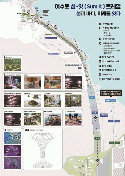 ‘여수로 섬-잇(Sum it) 트레일’ 사업은 총사업비 300억 원을 투입해 만흥동 일원을 해양관광의 핵심 거점으로 개발하고 관광 시설 현대화, 역사·문화 체험프로그램 발굴 등으로 여수세계박람회장과 만성리해수욕장을 관광벨트로 연결한다는 계획이다.