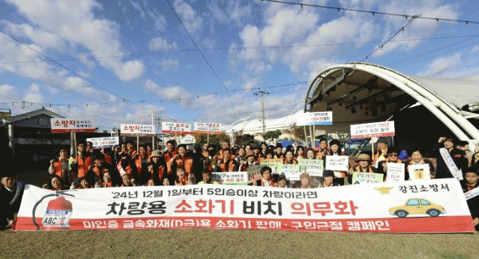 최기정 강진소방서장은 “11월은 불조심 강조의 달로 화재 증가에 대비해 생활 속 안전문화 확산을 위해 의용소방대와 함께 다양한 노력을 기울이겠다”라며 “특히 12월 1일부터 5인 이상의 모든 차량에 차량용 소화기 비치 의무화가 시행되어 적극 홍보하겠다”라고 말했다.