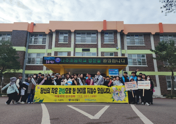 이날 나주초등학교와 금천중학교 정문 앞에서 관계기관 소속 80여 명이 학생과 학부모를 대상으로 아동학대 예방과 긍정 양육 방법을 담은 홍보물을 배포하며 아동 보호의 필요성을 알렸다.