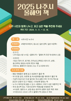 ‘2025 나주시 올해의 책’에 관한 자세한 내용은 나주시립도서관 누리집에서 확인할 수 있다.