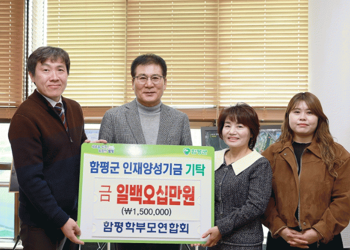 함평군은 19일 함평학부모연합회가 150만 원을 인재양성기금으로 기탁했다고 밝혔다. 이번 성금은 지난 11월 8일 함평교육지원청 주관으로 열린 ‘글로컬 한마당 행사’에서의 식음료 판매를 통한 수익금으로 마련됐다.