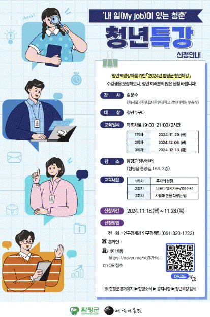 청년 역량 강화를 위해 마련된 이번 특강은 이달 29일부터 3주간 매주 금요일(19:00 ~ 21:00)에 진행될 예정으로, 올해 새롭게 준공한 함평군 청년센터에서 열린다.