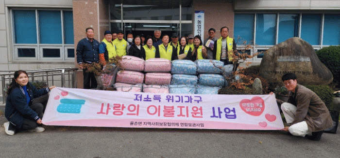 정갑주 위원장은 “율촌면지역사회보장협의체 연합모금사업 일환으로 추운 겨울에 특히 경제적으로나 정서적으로 어려움을 겪고 있는 지역주민들을 위해 겨울 이불을 지원하게 되어 기쁘다”며 “앞으로도 나눔 문화가 활성화될 수 있도록 적극 앞장서겠다”고 말했다.