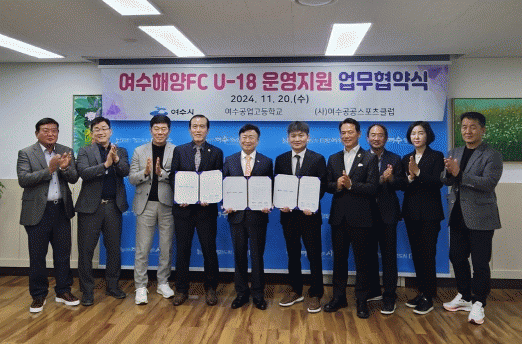 정기명 시장은 협약식에서 “오늘 이 자리는 유소년축구단 육성에 큰 진전을 이루는 중요한 이정표가 될 것”이라며 “여수시에서도 체육 인프라 확장 등 축구 유망주들이 훈련에 매진할 수 있도록 적극 지원하겠다”고 말했다.