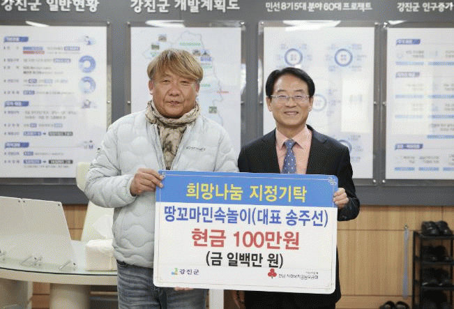 지난 20일 강진군청 군수실에서 열린 희망나눔 지정기탁식에서 땅꼬마민속놀이 송주선 대표가 100만 원을 기탁했다. 2024년 강진만 춤추는 갈대축제에서 연날리기 부스를 운영하며 받은 인건비를 통해 기부한 것으로 지역사회를 위한 깊은 애정과 헌신을 보여줬다.