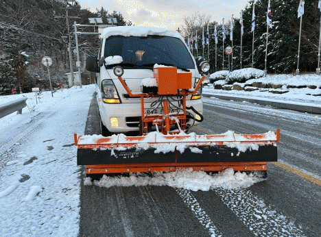 제설이 어려운 송지면 갈두재와 마산면 뚜드럭재, 북일면 오심재에는 원격으로 염수를 살포할 수 있는 염수 분사장치를 활용해 제설을 진행할 예정이다.