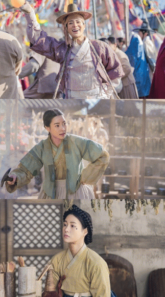 공개된 사진 속 구덕이는 마을 저잣거리에서 장사꾼의 행색을 한 채 무언가 팔고 있는 것은 물론 뒤집개를 든 채 요리를 하는 중 놀란 표정을 짓고 있다. 뿐만 아니라 눈 아래 커다란 점을 그려 넣고 머리까지 틀어 올린 채 영락없는 주모의 모양새까지 하고 있다.