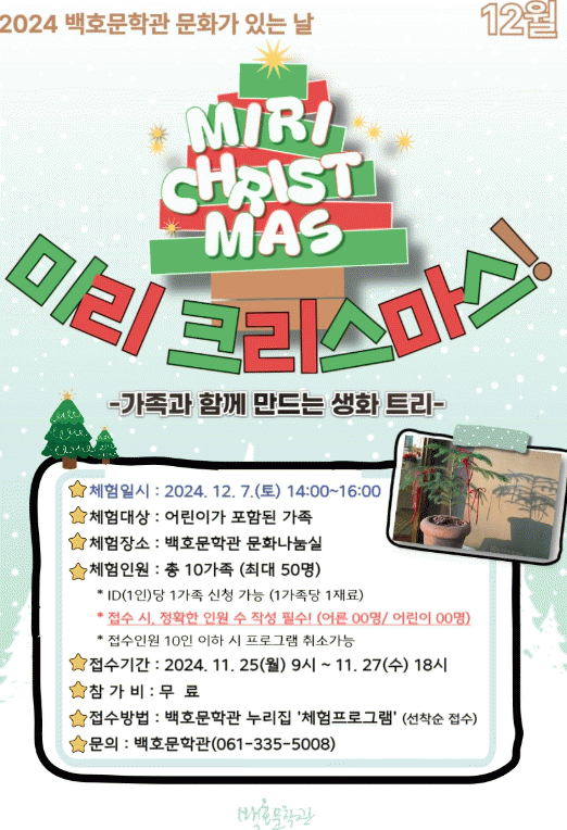 가족 간 소통과 관계 증진을 목표로 ‘미리크리스마스 - 가족과 함께 만드는 생화 트리’ 프로그램이 오는 12월 7일 오후 2시 백호문학관 문화나눔실에서 진행된다.