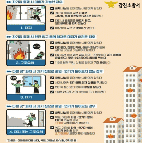 최기정 강진소방서장은 “불나면 살펴서 대피 방법은 공동주택 화재시 인명 피해를 최소화 하기 위한 것으로 입주민들이 상황에 맞는 대피 방법을 숙지하고 실천하는 것이 중요하다.”라며 “앞으로도 지속적인 홍보와 교육을 통해 안전 의식을 높일 계획이다.”라고 말했다.