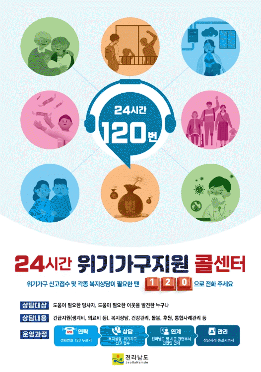 도민이 주변 생활이 어렵거나 도움이 필요한 취약계층을 발견하면 전남도 위기가구지원 콜센터, 복지위기알림 앱을 통해 손쉽게 신고할 수 있다.