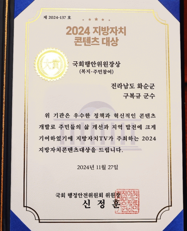 구복규 화순군수는 “상(賞)은 앞으로 더 잘하라고 주는 것”이라며 기쁨보다는 막중한 책임감을 먼저 내비쳤다.