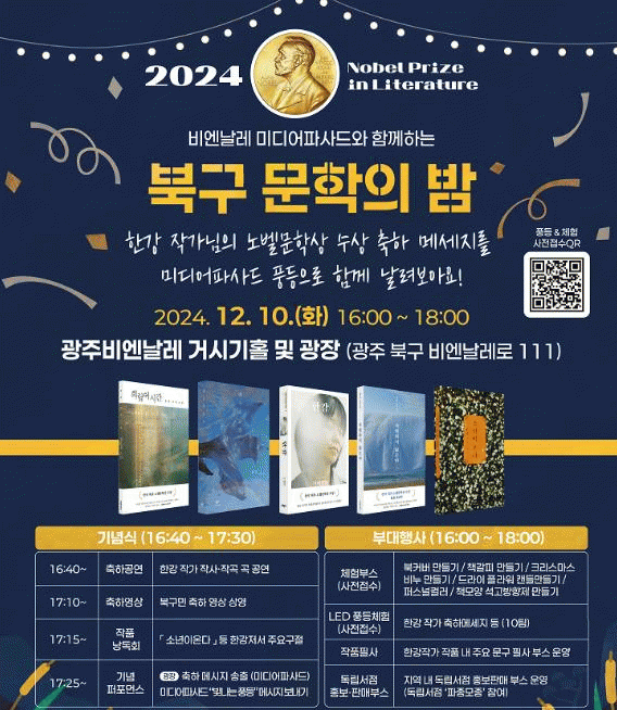 한편 문학의 밤 행사와 더불어 같은 날 ‘중흥도서관’에서는 ▲이희재 번역가의 한국 문학 속 빛나는 번역 특별강연 ▲체험 프로그램(‘노벨문학상 수상 기념 메달 키링 만들기’, ‘한강 관련 키워드 십자말 퍼즐 풀기’) ▲역대 노벨문학상 수상 작가 도서 전시전 등 ‘한강의 문학, 세계의 빛이 되다’ 주제로 축하 행사가 열린다.