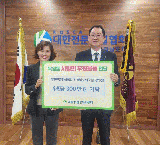 정미미 옥암동장은 “건설업 여건이 어려운 가운데서도 나눔문화 실천에 앞장서주신 대한전문건설협회 전라남도회에 진심으로 감사드린다. 취약한 우리 이웃들이 따뜻한 겨울을 날 수 있도록 더욱 살피겠다”고 말했다.