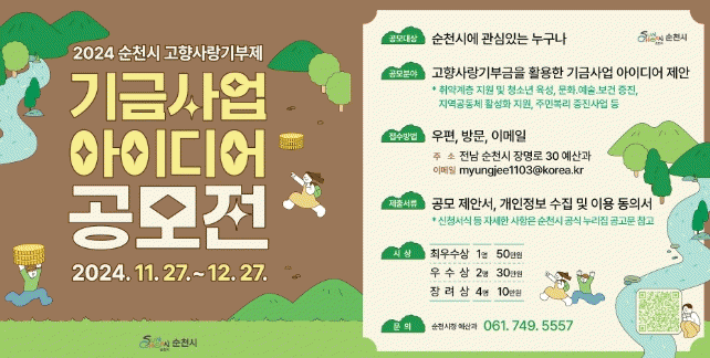 이번 공모는 고향사랑기부제를 통해 모인 기부금을 순천시만의 특색있고 가치 있는 곳에 사용하기 위해 마련했다.