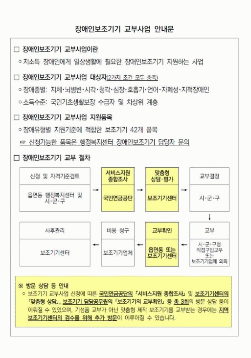 지원 대상은 기초생활보장수급자, 차상위계층 중 장애인복지법에 따라 등록된 지체·뇌병변·시각·청각·심장·호흡·언어·자폐성·지적장애인이며 장애유형에 따라 필요로 하는 보조기기를 지원하는 사업이다.