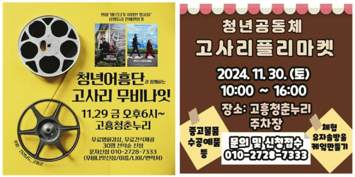 이번 행사는 청년어흥단 주최로 진행되며, 29일에는 무료 영화감상과 간식을 제공하는 ‘고사리 무비나잇’이 열리고, 30일에는 중고 물품과 수공예품 등을 나누고 판매하는 플리마켓과 유자 솔방울 케이크만 들기 체험 등 가족 단위 행사도 함께 진행될 예정이다.