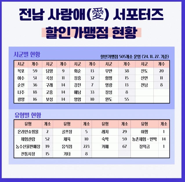 전라남도에 따르면 28일 현재 전남 사랑애 서포터즈 할인가맹점은 505개소다.