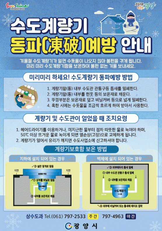가정 수도시설이 동파됐을 때는 우선 계량기함 내 밸브를 잠그고 즉시 광양시 상수도과[(주간)☎797-2533, 3585 (야간)☎797-4963)]로 신고해야 한다. 광양시는 동파 신고 접수창구를 내년 3월 초까지 편성해 동절기 비상 근무체계를 유지키로 했다.