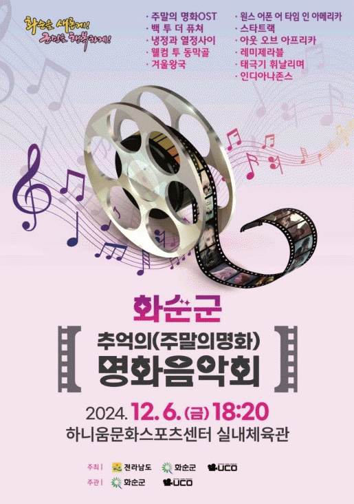 오케스트라 음악회는 2024년 화순군 지역대표 공연예술제의 일환으로 MBC 방영(1969~2010) ‘주말의 명화’ 영화들의 명장면을 대형스크린으로 상영하며, 동시에 명화의 OST를 오케스트라의 웅장한 선율로 연주하는 공연이다.