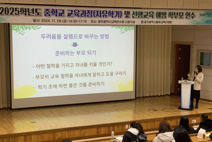 이번 연수는 중학교 입학을 앞둔 자녀를 둔 학부모의 불안감을 해소하고 내년도 중학교 교육과정을 안내하기 위해 마련됐다.
