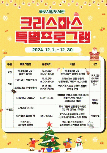 또, 강좌로는 12일 성인을 대상으로 ‘크리스마스 캔들 만들기’와 19일 초등생을 대상으로 ‘크리스마스 쿠키 만들기’가 진행되며, 어린이 자료실에서는 매주 겨울용품 만들기 체험 활동인 ‘도서관에서 겨울나기’와 대출자를 대상으로 선물을 증정하는 ‘도서관에 온 산타’를 운영한다.