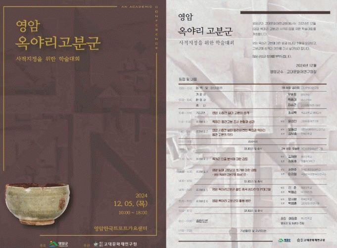 2부에서는 김재현 동아대 교수의 ‘옥야리 인골 분석에 대한 검토’, 서현주 한국전통문화대 교수의 ‘영암 일대 고분군의 토기에 대한 검토’, 신준 원광대 강사의 ‘영암 옥야리고분군 출토 중국 청자잔의 연대고찰’, 양시은 충북대 교수의 ‘영암 옥야리 고분군의 활용 방안’ 발표가 예정돼 있다.