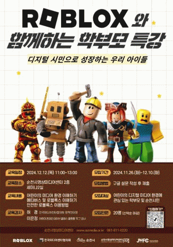 12일, ‘로블록스와 함께하는 학부모를 위한 디지털 시민의식 특강’에서는 어린이들이 많이 이용하는 몰입형 게임 및 창작 플랫폼 ‘로블록스’를 비롯한 디지털 미디어의 특징과 안전한 로블록스 이용 방법을 제공할 예정이다.