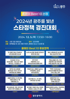 이병철 기획조정실장은 “2024년 광주를 빛낸 올해의 베스트10 정책은 무엇이 될지 시민의 냉정한 평가를 기다린다”며 “이 행사를 통해 시민의 의견을 반영한 정책 개발과 시행에 더욱 박차를 가할 계획이다”고 말했다.