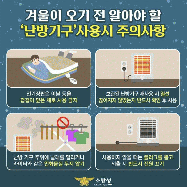 또한, 오랫동안 보관했던 난방기구를 재사용하기 전에는 전선이 끊어지거나 손상된 곳이 없는지 꼼꼼히 점검해야 한다. 전선 손상은 화재를 유발하는 주요 원인이기 때문에, 사소한 이상이라도 발견되면 즉시 교체하거나 전문가의 점검을 받는 것이 필수적이다.