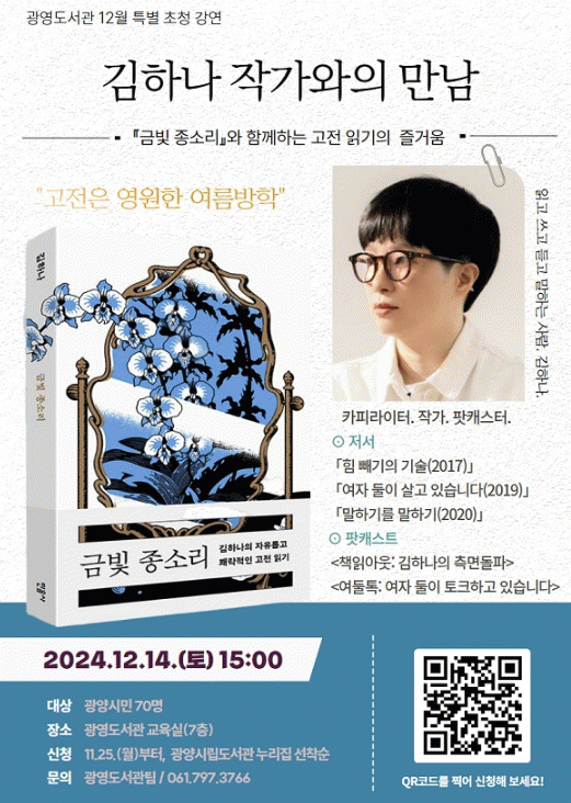 그녀의 최신작인 『금빛 종소리』는 세계문학전집에 포함된 고전 다섯 작품을 소개하는 고전 읽기 에세이로, 김하나 작가는 이번 강연에서 고전 문학의 매력과 독서가 주는 깊이 있는 즐거움을 시민들과 공유할 예정이다.
