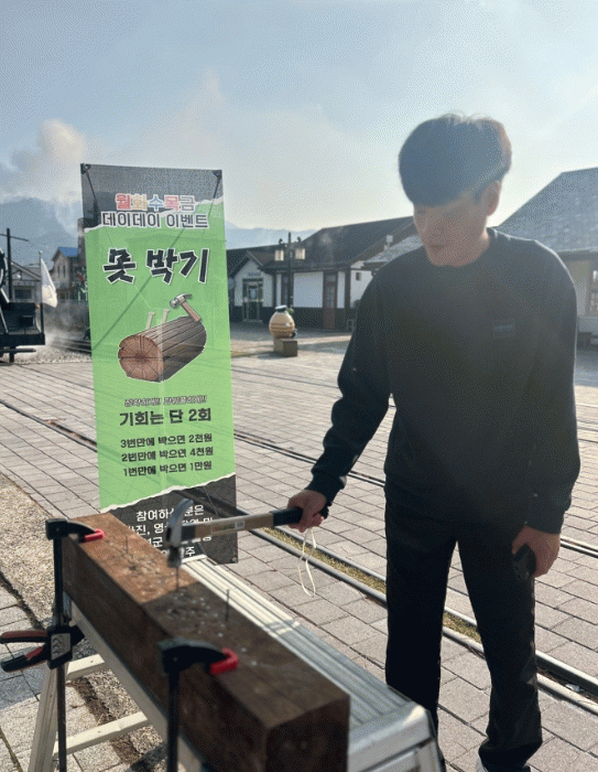 통나무에 못을 1번에 박으면 1만원이 지급되며, 2번에 성공하면 4천원, 3번에는 2천원을 받을 수 있다.