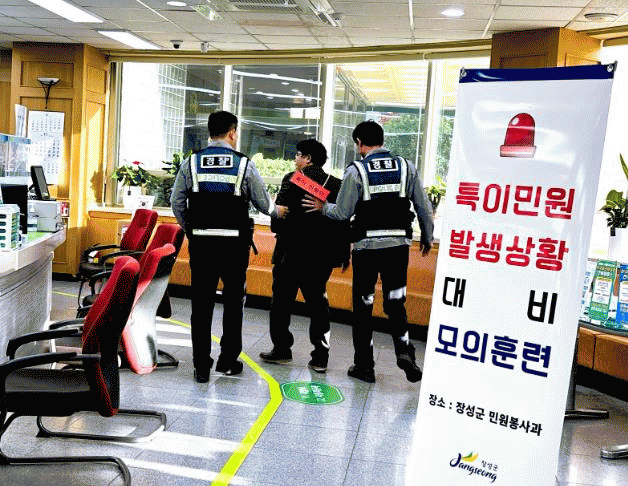 군 관계자는 “정기적인 특이민원 대비훈련을 통해 민원인과 공무원 모두의 안전을 상시 확보할 수 있도록 노력하겠다”고 말했다.