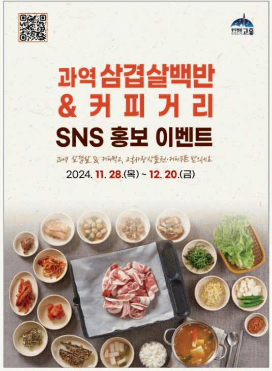 이벤트 참여 방법은 ①이벤트 기간 내 과역 삼겹살 백반·커피 거리를 방문해 삼겹살 백반 식사와 과역면 카페를 이용한 후 ②고흥관광 사회관계망서비스(SNS) 팔로우하고 ③ 고흥관광 홈페이지 팝업창 및 각 음식점에 게시된 홍보 포스터에서 제공되는 QR코드를 스캔하거나 네이버 폼 링크 이벤트 페이지에 접속해 간단한 신청서를 작성하면 된다.