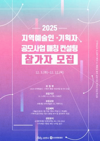 한편, ‘2025 지역예술인·기획자 매칭 지원사업’은 2021년부터 총 133명이 참여했고 공모사업 선정 규모는 총 39건, 54억 9천만원으로 순천 예술인들의 공모사업 접근성을 높이고 자발적으로 활동할 수 있는 기반을 마련하는 데 기여하고 있다.