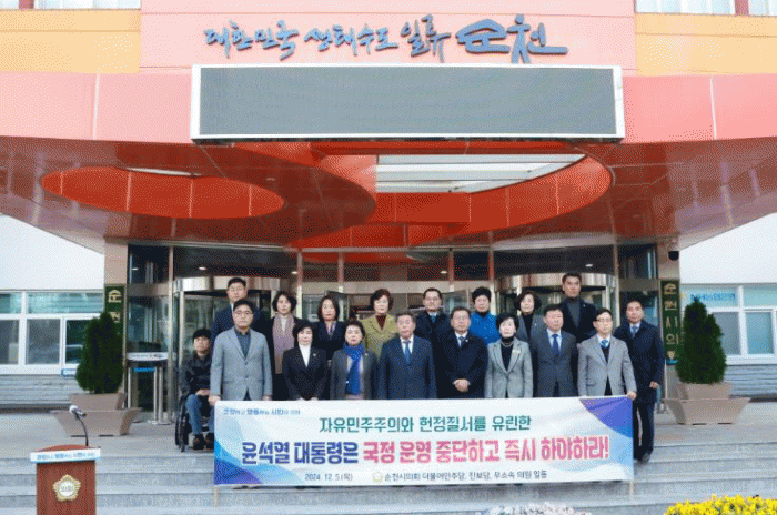순천시의회는 “대한민국 헌정질서와 민주주의를 유린하여 국민을 짓밟은 윤석열 대통령의 즉시 하야”를 요구하며, “윤석열 대통령이 자진 사퇴하지 않을 경우 국회가 국민의 뜻을 받들어 즉시 탄핵할 것”을 촉구했다.