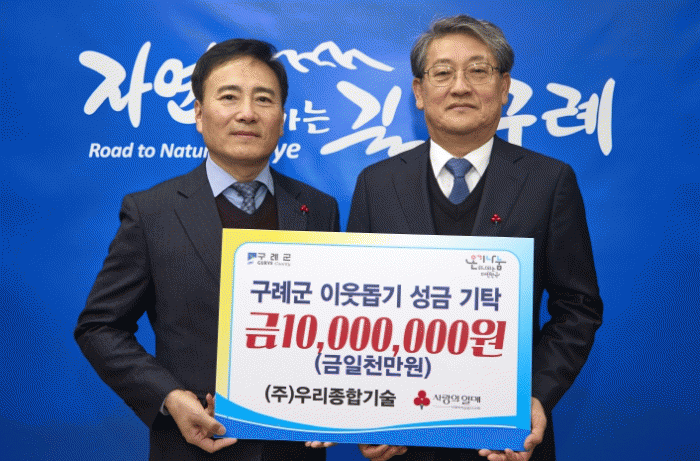 ㈜우리종합기술(대표 김성생)은 2016년 12월부터 매년 구례군 저소득층을 위한 정기 기부활동을 이어가고 있다.