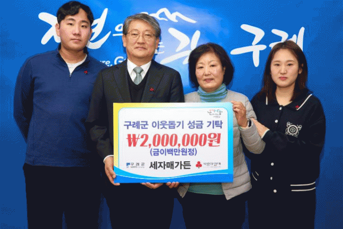 김순호 군수는 감사의 뜻을 표하며 “세자매가든의 따뜻한 기부는 혹한기에 어려움을 겪는 이웃들에게 큰 힘이 될 것이다. 소중한 성금이 꼭 필요한 이웃들에게 전달될 수 있도록 하겠다”고 밝혔다.