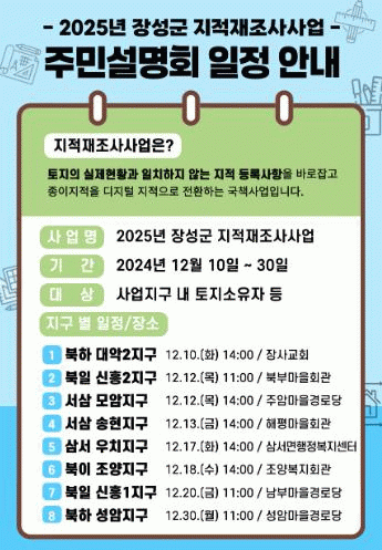 장성군은 주민설명회 이후 토지소유자 · 토지면적의 3분의 2 이상 동의를 얻어 전라남도에 지적재조사사업지구 지정을 신청할 예정이다.
