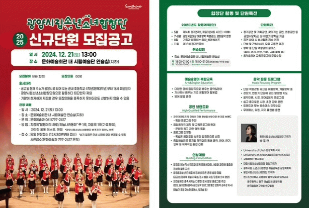 자세한 사항은 광양시 홈페이지 공고란에서 확인할 수 있다. 관련해 궁금한 점은 광양시 문화예술과 또는 소년소녀합창단로 문의하면 된다.